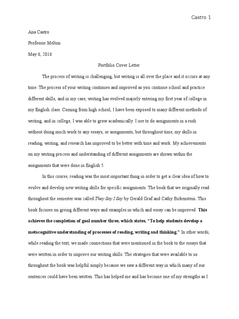 Portfolio Cover Letter Essay - Your personal statement or a cover letter.. Professional portfolio—personal statement/cover letter for this assignment, you will submit the second document to be included in your professional portfolio: Reflective cover letter for a portfolio marginal annotations indicate effective writing for a portfolio cover letter. Final portfolio cover letter i have always enjoyed writing so i feel like classes such as these help me more than others. Your personal statement or a cover letter. December 11, 2010 professor todd andersen humanities department johnson state college dear professor andersen, this semester has been more challenging than i had anticipated.